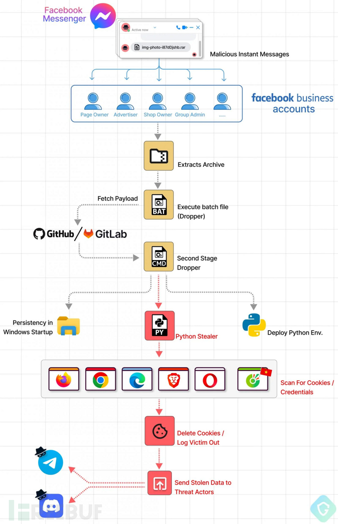 Bleeping Computer 网站披露,惊现某黑客组织通过一个伪造和受损的网络万 Facebook 账户网络,发送数百万条 Messenger 钓鱼信息,钓鱼利用密码窃取恶意软件攻击 Facebook 企业账户。浪潮