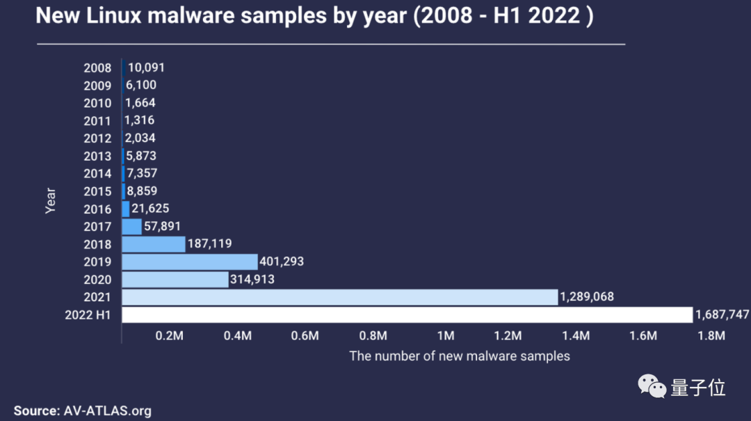 根据AV-ATLAS团队提供的数据,新的Linux恶意软件的数量在2022年上半年达到了历史新高,发现了近170万个。