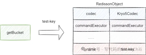 复制//生成 test-key 的bucket RBucket<Object> bucket = redissonClient.getBucket("test-key"); //查看对应的bucket是否存在 if (ObjUtil.isEmpty(bucket.get())) { //基于set指令进行插入 bucket.set("test-value"); //尝试通过get获取值 Object value = bucket.get(); log.info("value:{}", value);}1.2.3.4.5.6.7.8.9.10.对于RBucket对象的set和get操作本质上都是基于redis字符串操作指令set和get的一层封装,源码库在我们调用getBucket获取对应key的从使bucket的时候,redisson会基于当前客户端的连接信息和bucket键进行一次封装得到一个test-key的bucket对象:
