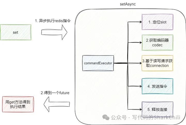 复制@Override public void set(V value) { //基于setAsync提交异步set操作,然后通过get获取执行结果 get(setAsync(value)); }1.2.3.4.5.对应的我们步入setAsync可以看到它会拿着我们上一步初始化所得来的key名称、编码器、set操作指令对象以及编码后的value值通过commandExecutor进行异步写入到redis服务端: