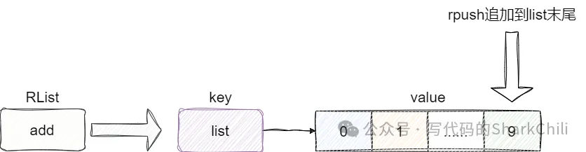 复制RList<Object> list = redissonClient.getList("list"); //循环添加元素 for (int i = 0; i < 10; i++) { list.add(i); } //移除索引0位置的元素 list.remove(0);1.2.3.4.5.6.7.getList和上述bucket操作类似这里就不多追赘述,这里我们就看看add的实现细节,本质上它就是异步调用redis的RPUSH指令将元素追加到列表末尾,整体流程原理和上述set操作差不多,这里就不多做赘述了: