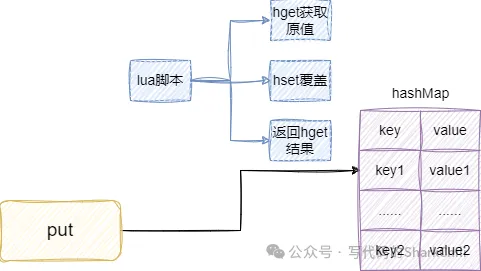 复制@Override public RFuture<V> putAsync(K key, V value) { //进行键值对检查 checkKey(key); checkValue(value); //基于putOperationAsync执行键值对插入操作 RFuture<V> future = putOperationAsync(key, value); if (hasNoWriter()) { return future; } //返回结果 return mapWriterFuture(future, new MapWriterTask.Add(key, value)); }1.2.3.4.5.6.7.8.9.10.11.12.13.所以来到putOperationAsync即可看到这段核心代码的实现,本质上为了保证返回覆盖前的值,redis用到的lua脚本,该脚本的执行流程为: