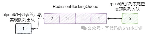 复制RBlockingQueue<String> blockingQueue = redissonClient.getBlockingQueue("blockingQueue"); //添加元素 blockingQueue.put("element"); //取出元素 String value = blockingQueue.take(); log.info("value:{}", value);1.2.3.4.5.6.7.实际上队列的实现也是基于redis的列表,通过rpush实现入队,lpop实现出队: