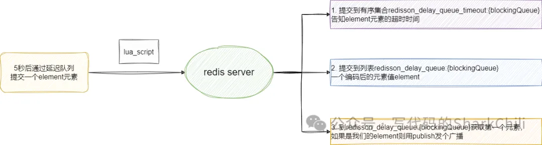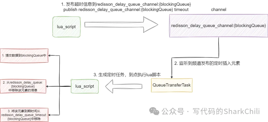 复制2025-01-14 10:52:27.134 INFO 17684 --- [ main] com.sharkChili.TestRunner : value:element cost:5034ms1.其实现原理也很简单,上述代码我们指明了队列名称为blockingQueue,在使用offer进行延迟提交本质上就是通过lua脚本实现元素延迟提交,其工作内容为: