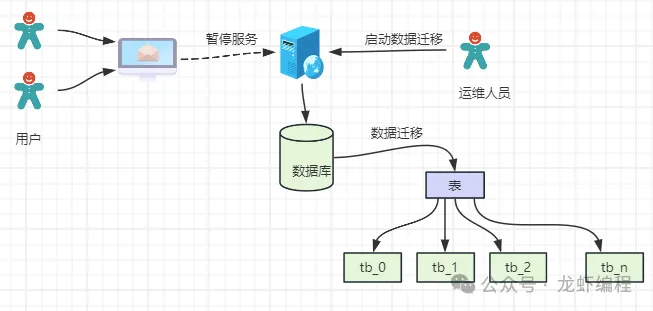 2.1 停机迁移停机迁移是一种直接且粗暴的方法,停机迁移会影响用户的正常访问,所以通常会提前给用户一个友好的通知,如下是停机迁移的图: