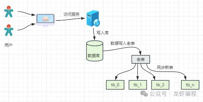 2.2 双写策略双写策略是继续向老表写入数据,同时再根据分表策略把数据写入到新的分表中,并记录开始同步新表数据的时间,如下图所示: