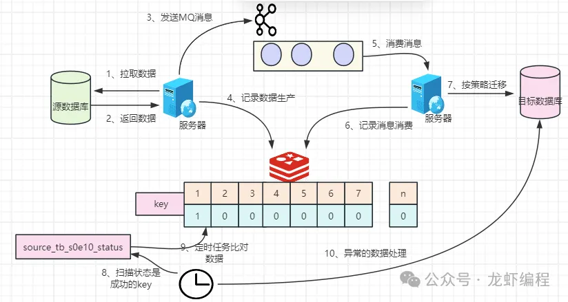 执行迁移方案就是将源表中的数据分组后使用MQ的方式发送到消息队列中,然后在Redis的bitmap中记录每条数据的迁移情况,如下所示: