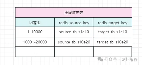 同时在Redis中也需要记录每个分组(如1-10000)中本次迁移的开始时间,使用key单独记录(如source_tb_s1e10_startTime);记录每个分组中迁移的状态(如迁移完成、正在迁移),使用key单独记录(如source_tb_s1e10_status)。