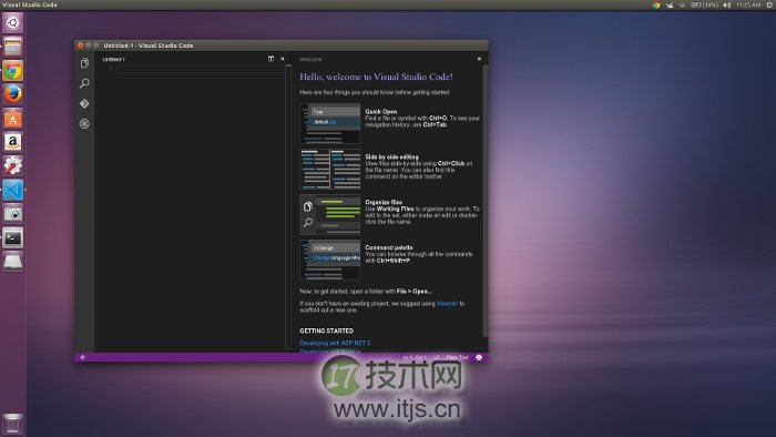 确定之后,安装程序会开始下载并安装。安装完成后,你可以发现Visual Studio Code 图标已经出现在了Unity启动器上。点击图标开始运行!下图是Ubuntu 15.04 Unity的截图: