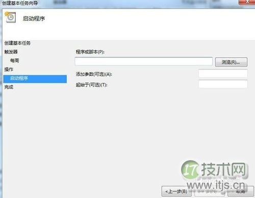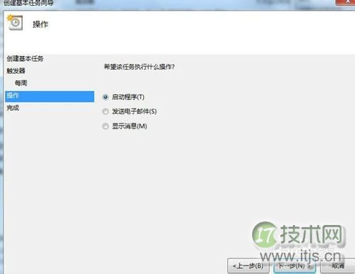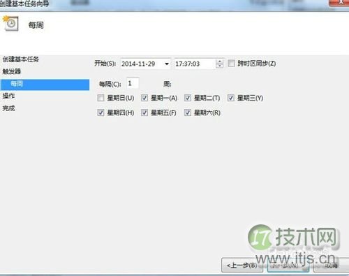 5、在弹出“触发器”窗口选择时间,因为每天下班都是周期性,这里选择每周(具体根据个人设置而定),然后点击下一步!