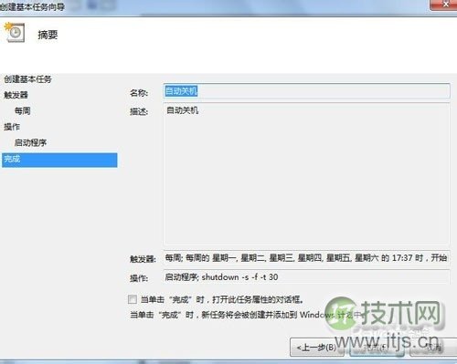 8、在“程序或脚本”输入shutdown,“添加参数“输入-s -f -t 30,意思是任务触发后,将30秒内自动关机,然后点击下一步,选择完成!