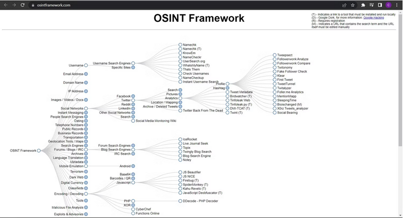 OSINT Framework是一个包含不同工具的网站,用户可以使用这些工具在不同的系统和知识库中查询开源情报信息,包括电子邮件地址、社交媒体、域名、搜索引擎、公共记录、文档甚至电话号码等。