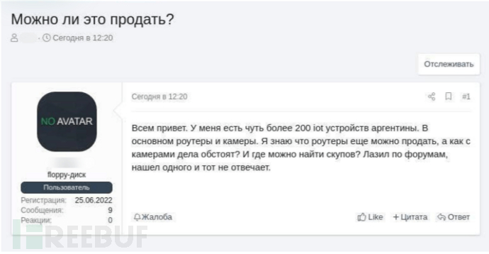 在极少数情况下,暗网论坛上也可以购买到预感染设备网络。不过,这种性质的广告并不常见。例如,下面截图中的用户正在为位于阿根廷的由200台路由器和摄像头组成的僵尸网络寻找新的所有者。
