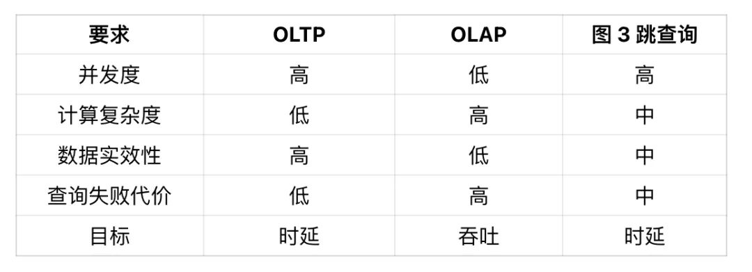 首先在并发方面,OLTP 的并发度很高,而 OLAP 则相对较低。图的三跳查询,服务的仍然是在线场景,其并发度也相对较高,这块更贴近 OLTP 场景。