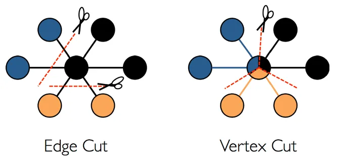图切分的含义是,如果我们拥有一个巨大的图,规模在百亿到千亿水平,应该如何将其存储在集群的各节点之中,即如何对其切分。在工业界中,主要存在两种典型的切分策略:边切分和点切分。