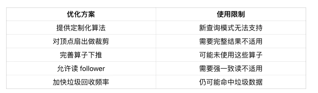 我们之前已经实施了一些优化,可以称之为优化方案 1.0。当时主要考虑的是如何快速满足用户需求,因此我们的方案包括:首先根据常用的查询模式提供一些定制化的算法,这些算法可以跳过解析、校验、优化和执行等繁琐步骤,直接处理请求,从而实现加速。其次,我们会对每个顶点的扇出操作进行优化,即每个顶点在向外扩展时,对其扩展数量进行限制,以避免超级点的影响,降低时延。此外,我们还完善了算子的下推策略,例如 filter、sample、limit 等,使其尽可能在存储层完成,以减少网络带宽的消耗。同时,我们还允许读从节点、读写线程分离、提高垃圾回收频率等优化。
