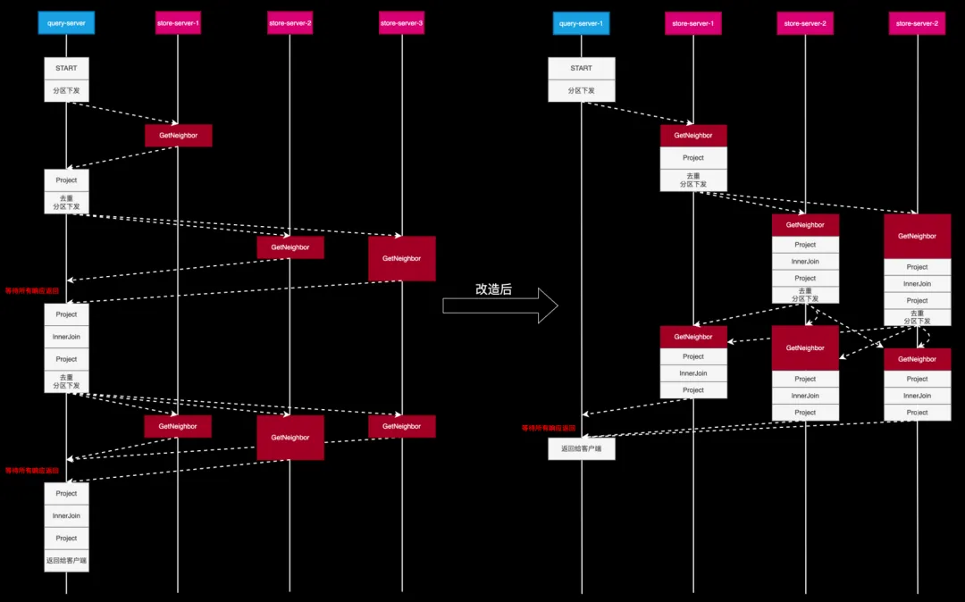 如上文所说,在图查询场景中一般不需要做全局性的更新,查询节点收到各存储节点的响应后,只是简单地再次分区然后下发,所以存储节点的结果转发到查询层,再从查询节点分发到各存储节点很浪费。