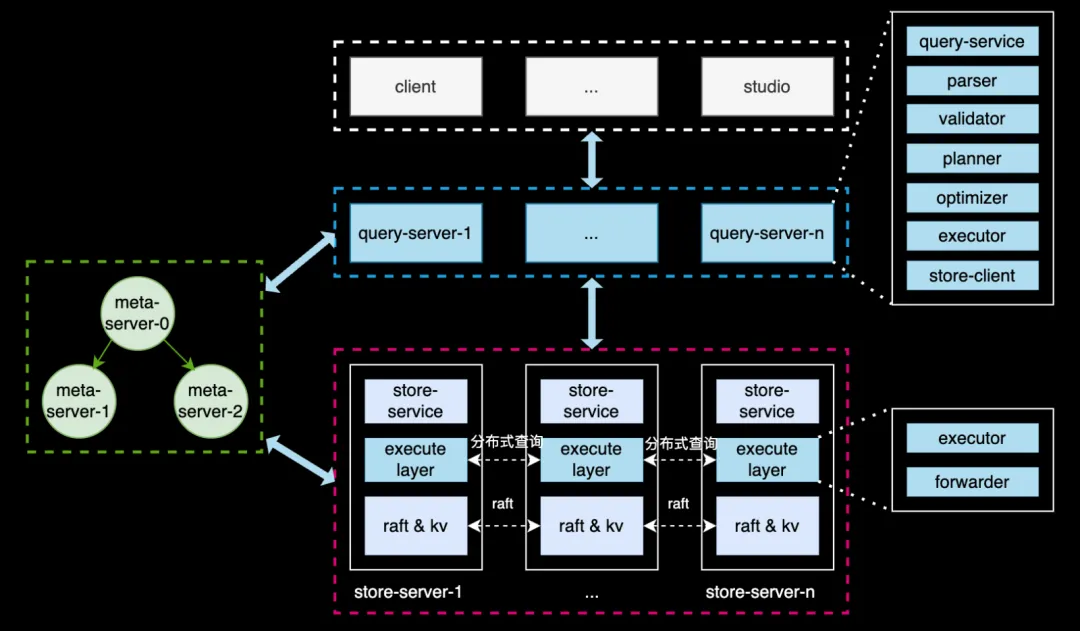 首先一个问题是,在进行改造时如何确保不会对原始的 1-2 跳产生负优化。在企业内部进行新的改造和优化时,必须谨慎评估所采取的措施是否会对原有方案产生负优化。我们不希望新方案还未能带来收益,反而破坏了原有的系统。因此,架构总体上与原来保持一致。在 Store Server 内部插入了一层,称为执行层,该层具有网络互联功能,主要用于分布式查询的转发。Query Server 层则基本保持不变。