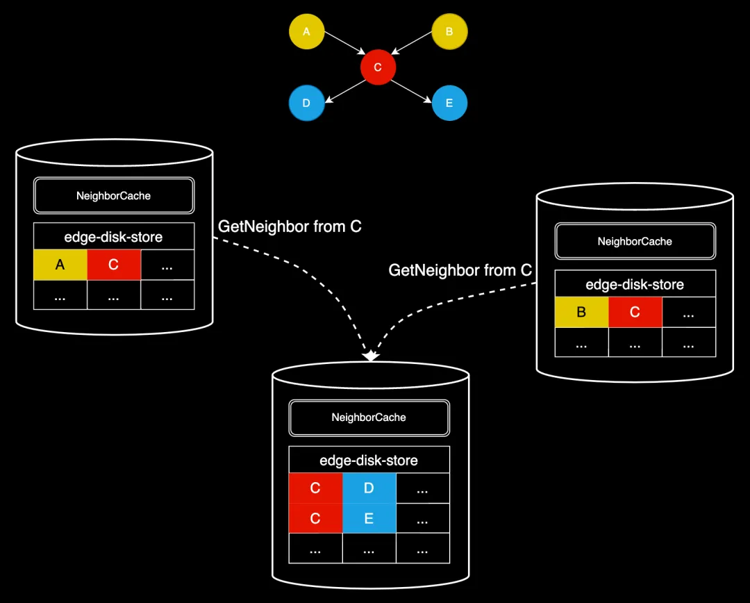 如果每一跳产生的重复终点 ID(将会作为下一跳的起点 ID)很多,分布式查询反而会带来劣势。为解决这一问题,我们引入一套起点 ID 去重机制 —— NeighborCache,具体方案如下: