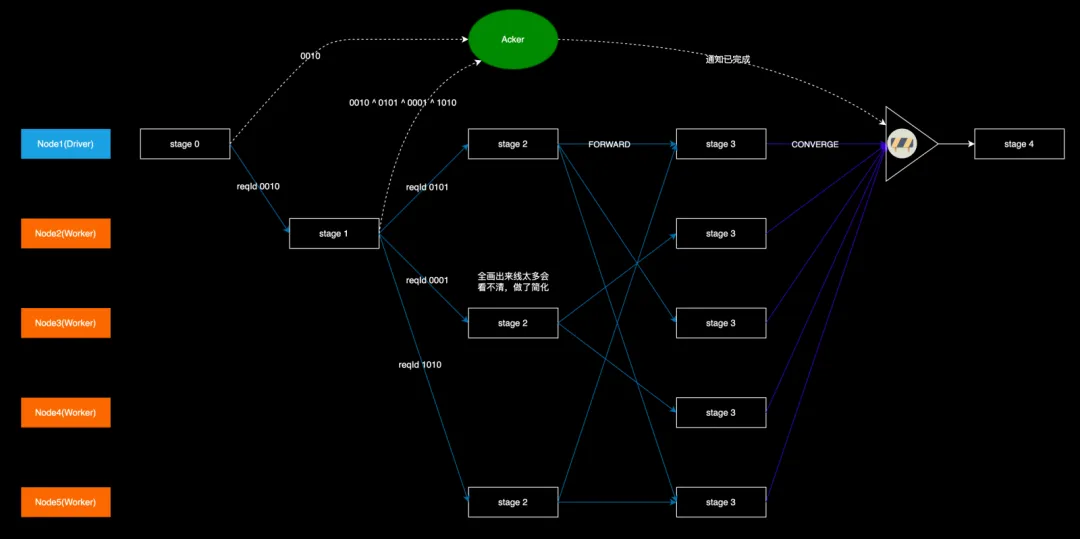Acker 上有一个初始的 checksum 值 0000;stage-0 在扩散到 stage-1 时,生成了一个随机数 0010(这里为了表达简便,以 4 位二进制数代替),这个 0010 是 Node2 上的 stage-1 的 Id,然后把这个 0010 伴随着 Forward 请求发到 Node2 上,同时也发到 Acker 上,这样就表示 0010 这个 stage 开始了,Acker 把收到的值与本地的 checksum 做异或运算,得到 0010,并以此更新本地 checksum;stage-1 执行完后扩散到 stage-2 时,由于有 3 个目标节点,就生成 3 个不相同的随机数 0101、0001、1010(需要检查这 3 个数异或之后不为 0),分别标识 3 个目标节点上的 stage-2,然后把这 3 个数伴随着 Forward 请求发到 Node1、Node3、Node5 上,同时在本地把自身的 stage Id(0010)和这 3 个数一起做异或运算,再把运算的结果发到 Acker,Acker 再次做异或运算,也就是 0010 ^ (0010 ^ 0101 ^ 0001 ^ 1010),这样 0010 就被消除掉了,也就表示 stage-1 执行完成了;重复上述过程,最后 Acker 上的 checksum 会变回 0,表示可以驱动 stage-4。注意:尽管在某个节点的 stage 扩散时检查了生成的随机数异或不为 0,但是多个节点间生成的随机数异或到一起还是可能为 0 的,比如 Node1 的 stage-2 生成的 3 个数异或后为 0001,Node3 的 stage-2 异或后为 0010,Node5 的 stage-2 异或后为 0011,0001 ^ 0010 ^ 0011 = 0。这样就会导致 stage-3 还在执行中时,DistDriver 就误认为它已经执行完毕,提前驱动 stage-4 的执行。