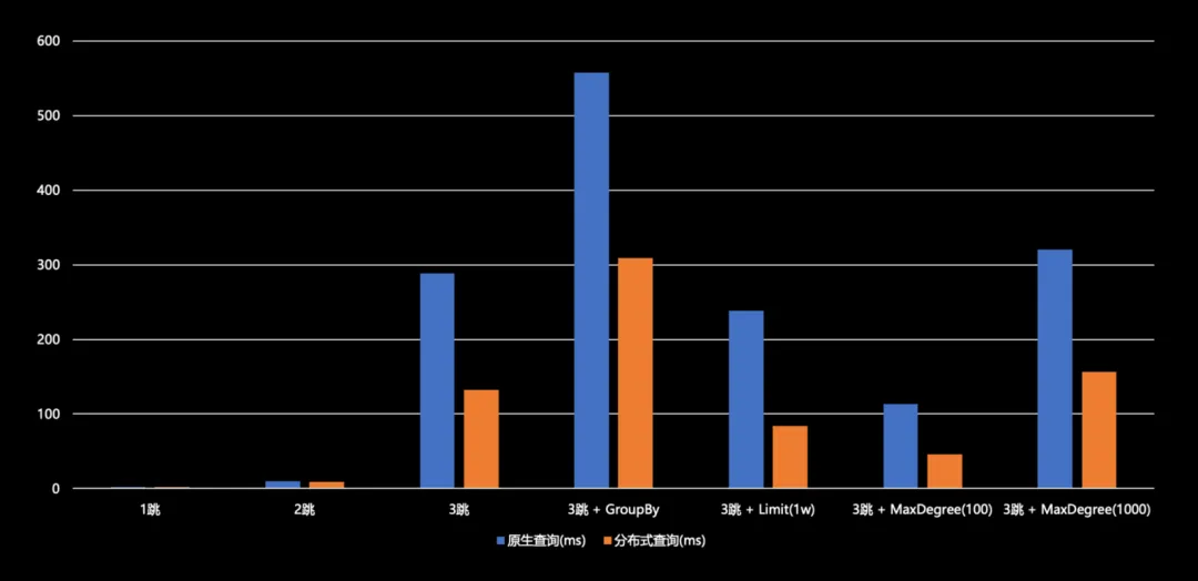 根据测试结果显示,在一跳和二跳情况下,原生查询和分布式查询性能基本相当,未出现负优化现象。从三跳起,分布式查询相较于原生查询能实现 50% 至 60% 的性能提升。例如,在 Max degree 场景下的分布式查询已将时延控制在 50 毫秒以内。在带有 Max degree 或 Limit 值的情况下,时延均在 200 毫秒以下。尽管数据集与实际业务数据集存在差异,但它们皆属于社交网络领域,因此仍具有一定的参考价值。