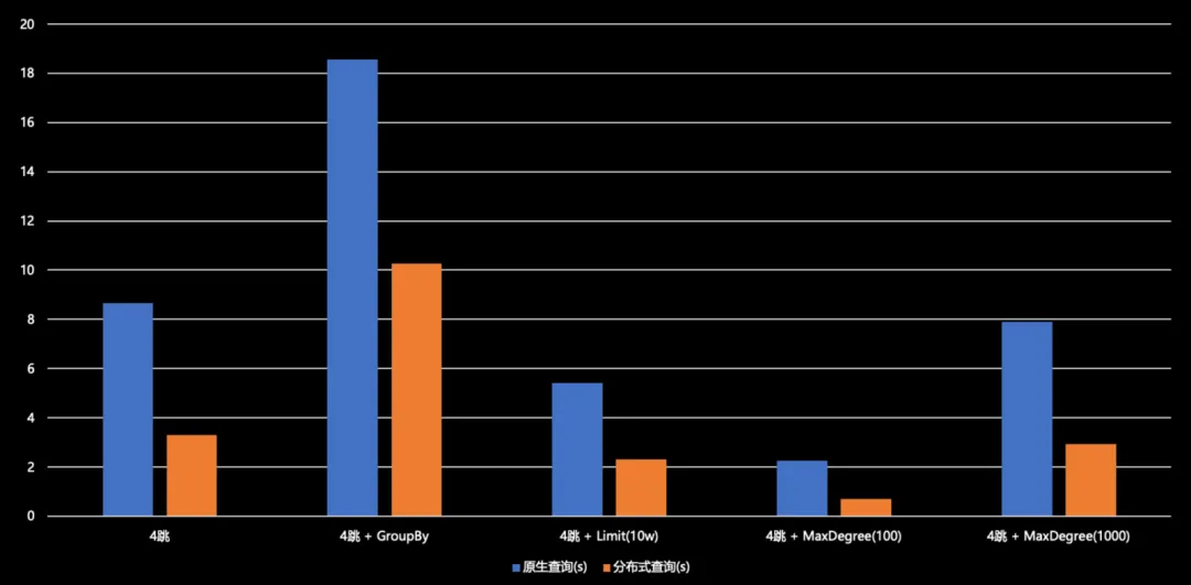 四跳查询,无论是原始查询还是分布式查询,其时延的规模基本上都在秒至十余秒的范围内。因为四跳查询涉及的数据量实在过于庞大,已达到百万级别,仅依赖分布式并行查询难以满足需求,因此需要采取其他策略。然而,即便如此,我们所提出的改进方案相较于原始查询模式仍能实现 50% 至 70% 的提升,效果还是很可观的。