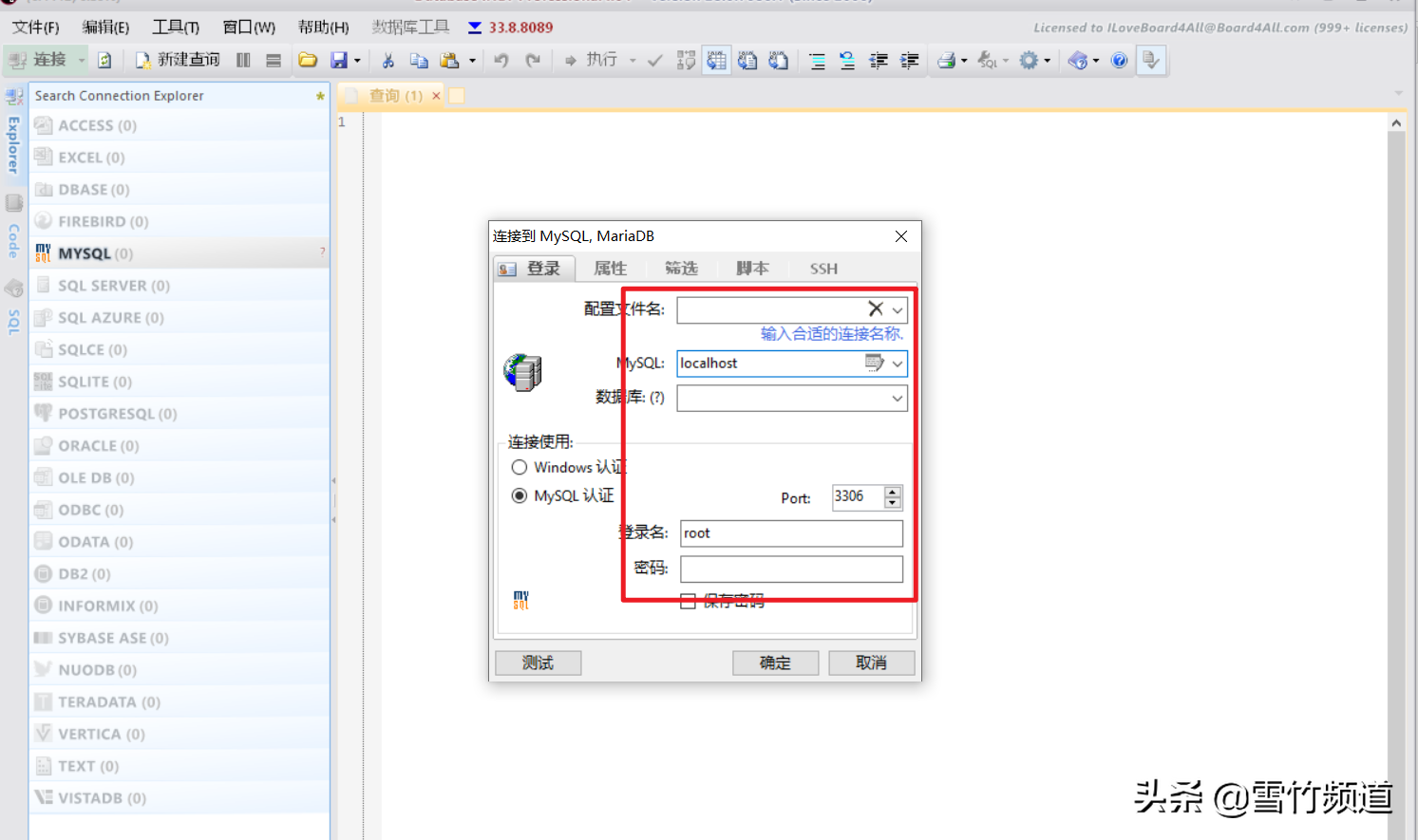 2、点击右侧菜单栏,先择要连接的数据库,填写连接相关信息即可成功连接。
