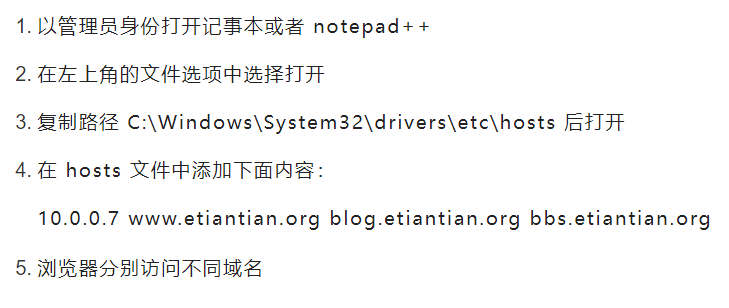 # tail -1 /etc/hosts 10.0.0.7 www.etiantian.org blog.etiantian.org bbs.etiantian.org| 配置windows hosts并访问