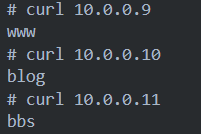 # vim /application/nginx/conf/extra/01_www.etiantian.org.conf server { listen 10.0.0.9:80; server_name 10.0.0.9; location / { root html/www; index index.html index.htm; } } # vim /application/nginx/conf/extra/02_blog.etiantian.org.conf server { listen 10.0.0.10:80; server_name 10.0.0.10; location / { root html/blog; index index.html index.htm; } } # vim /application/nginx/conf/extra/03_bbs.etiantian.org.conf server { listen 10.0.0.11:80; server_name 10.0.0.11; location / { root html/bbs; index index.html index.htm; } }| 检查语法并重启