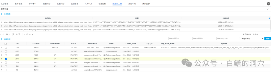 最近我们正在V2.7中开发两个日常运维常用的工具,其中一个是杀会话的工具。当某个数据库出现一些性能等方面的问题的时候,杀会话可能是一个常用的运维动作。不过有些时候当你需要杀会话的时候突然发现数据库已经无法登录了,你无法有效地杀掉所需要杀的会话,这时候D-SMART就可以帮助你轻松地帮你分析系统中会话的情况,找到所需要杀的会话,并立即无风险地杀掉。