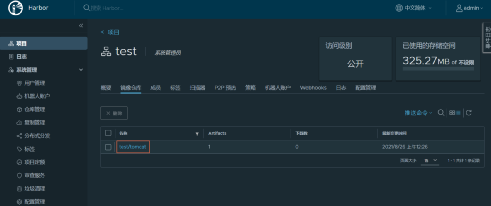 # 在docker主机上拉取测试镜像 [root@docker-01 ~]# docker pull tomcat # 在docker主机上生成离线镜像包 [root@docker-01 ~]# docker save -o tomcat.tar.gz tomcat # 在docker主机上加载离线镜像包 [root@docker-01 ~]# docker load -i tomcat.tar.gz # 在docker主机上给要进行上传的镜像打标签 [root@docker-01 ~]# docker tag tomcat:latest 10.0.0.201/test/tomcat:v1 # 在docker主机上将指定打标的镜像进行上传到harbor私有仓库中 [root@docker-01 ~]# docker push 10.0.0.201/test/tomcat:v1 说明:执行上面命令就会把10.0.0.201/test/tomcat:v1上传到harbor里的test项目下5.harbor私有仓库查看镜像: