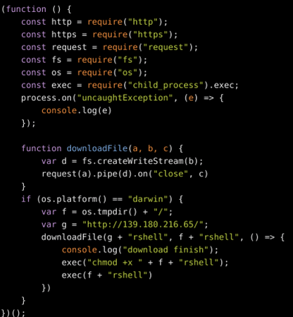 该代码执行时会检查环境是否是macOS,然后从139.180.216.65下载rshell。提取的payload会下载temp文件夹中,修改为具有执行权限,然后执行。反混淆后的代码如下所示: