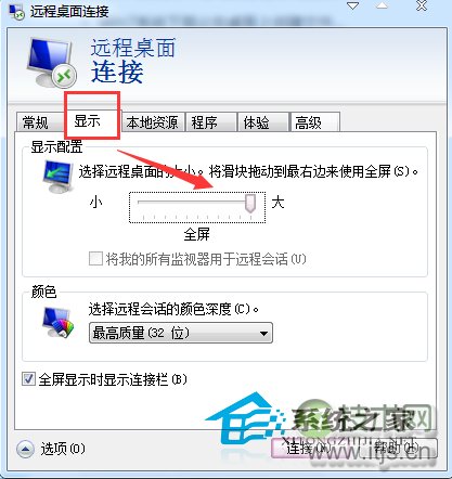 2、桌面切换到“显示”标签页,无法将滑条拖到最右边,全屏再点击连接。动滚动条