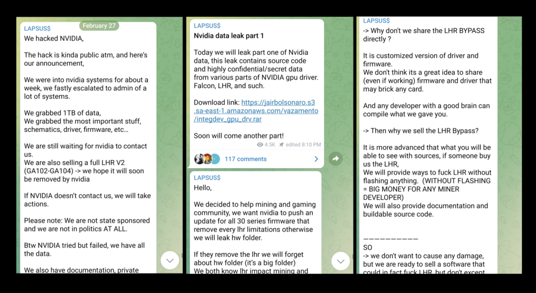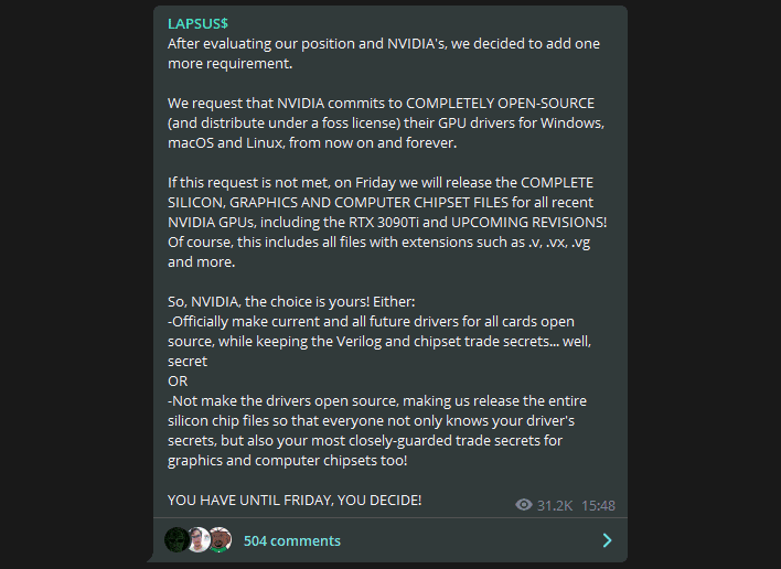3月1日,根据PCMag的消息,LAPSU$表示,他们希望英伟达将所有已发布和未来显卡的Windows、MacOS、Linux等版本驱动在FOSS协议下全部永久开源。如果在给定时间内英伟达没有做出行动,他们就将公布英伟达所有已发布和将发布的显卡产品规范、图纸和芯片组的信息。
