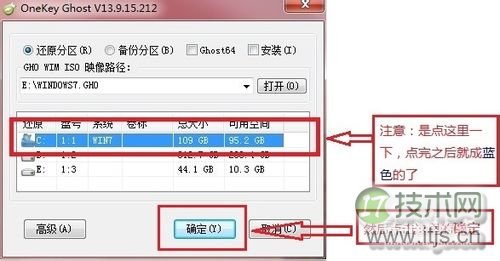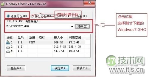 3、接下来,在Onekey ghost选择还原分区,在GHO WIM ISO映像路径中选择刚才下载的Windows 7系统镜像Windows 7.GHO,如下图
