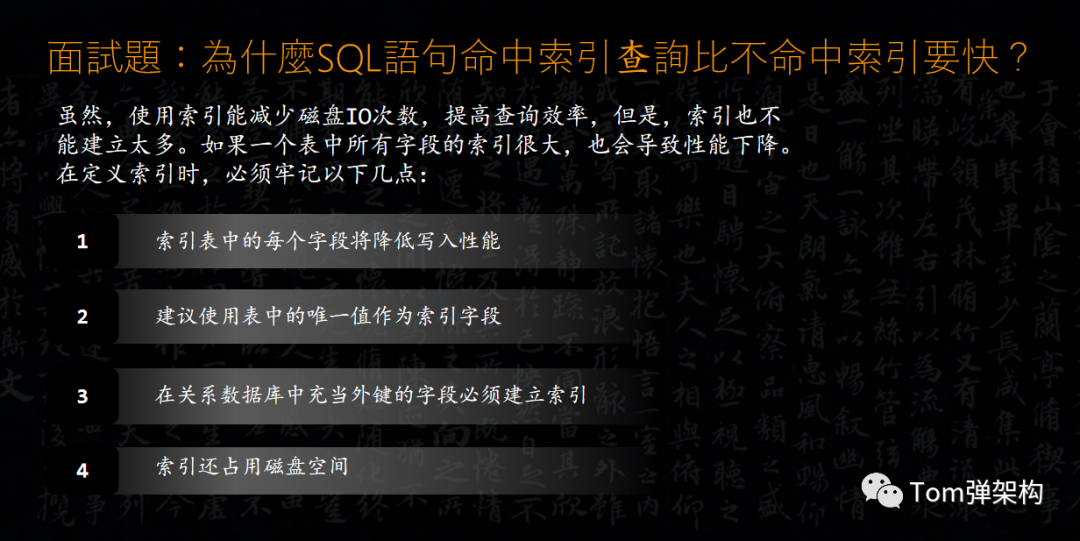 3.索引的弊端虽然,使用索引能减少磁盘IO次数,提高查询效率,但是,索引也不能建立太多。如果一个表中所有字段的索引很大,也会导致性能 l下降。想象一下,如果一个索引和一个表一样长,那么它将再次成为一个需要检查的开销。这就好比字典的目录非常详细,但是其长度已经和所有的文字一样长,这个时候目录本身的效率就大大下降了。