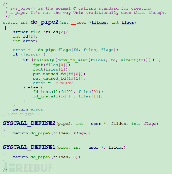 复制/** * struct pipe_buffer - a linux kernel pipe buffer * @page: 管道缓冲区存放了数据的页 * @offset: 在@page中数据的偏移 * @len: 在@page中数据的长度 * @ops: 该buffer的函数表,参见@pipe_buf_operations. * @flags: 管道缓冲区的标志位, * @private: 函数表的私有数据 **/struct pipe_buffer { struct page *page; unsigned int offset, len; const struct pipe_buf_operations *ops; unsigned int flags; unsigned long private;};1.2.3.4.5.6.7.8.9.10.11.12.13.14.15.16.有两个系统调用可以创建管道,pipe、pipe2.这两个系统调用最终都会调到 do_pipe2()函数。