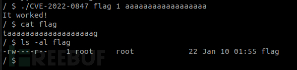 flag文件只有读权限没有写权限,使用CVE-2022-0847向这个文件写入内容。