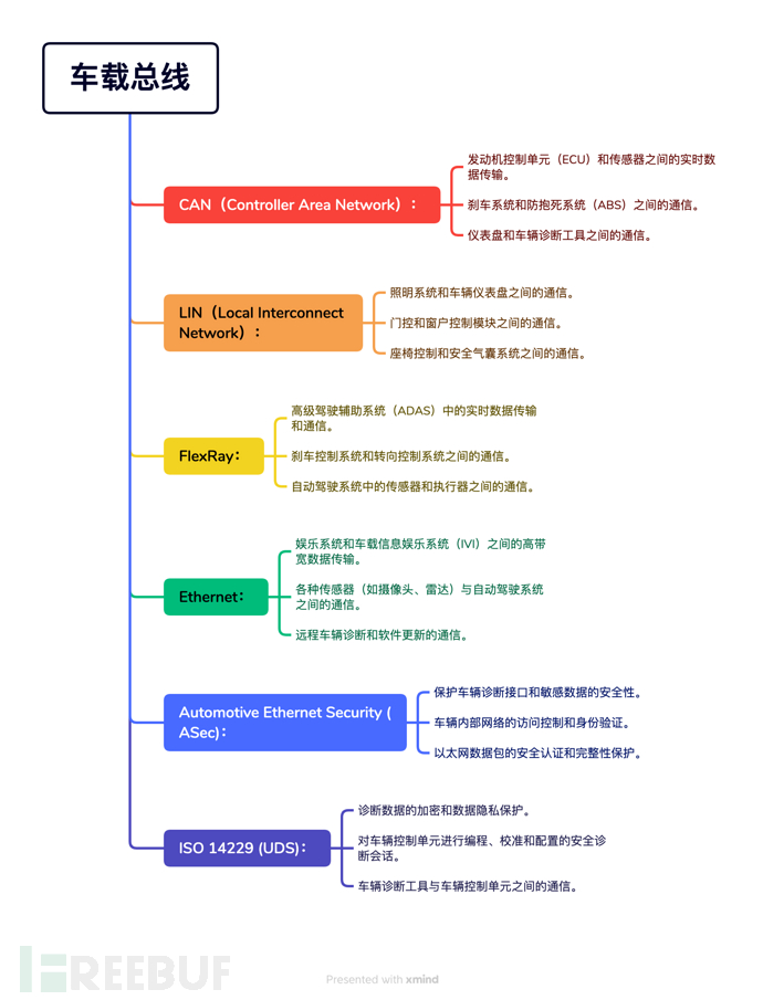 BMW i3攻击(2018年):黑客通过LIN总线入侵了一辆BMW i3电动汽车,成功控制了车辆的门锁和车窗等功能。福特Focus攻击(2019年):黑客通过LIN总线攻击了福特Focus车辆的车窗控制系统,成功实现了远程开启和关闭车窗。FlexRay: