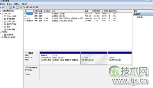 用Windows 7自带的压缩卷功能对硬盘分区做调整,调整出30G的空间来。