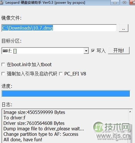 打开MAC 硬盘安装助手,选择下载的Mac OS X安装盘,如下图,3个选项都去掉,目标分区选择刚才分好的7G安装文件区(这里假如看不到刚分的新区的盘符,重启一下就可以看到了),写入过程中有可能出现程序无响应的情况,不用管它,只要硬盘在读写就没有问题。几分钟完成后,假如提示Change partition type to AF:Failed也没有关系,服务器租用因为我们在分区的时候已经把ID设为了AF。