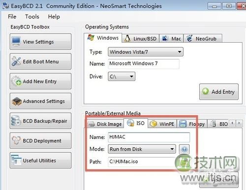 2、EasyBCD添加HJMAC.iso的启动项到Windows 7启动菜单: