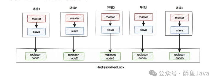 搭建几套相互独立的 Redis 环境,我们这里搭建5套。每套环境都有一个 redisson node 节点。多个 redisson node 节点组成 RedissonRedLock。环境包括单机、主从、哨兵、集群,可以一种或者多种混合都可以。我们这个例子以主从为例来说