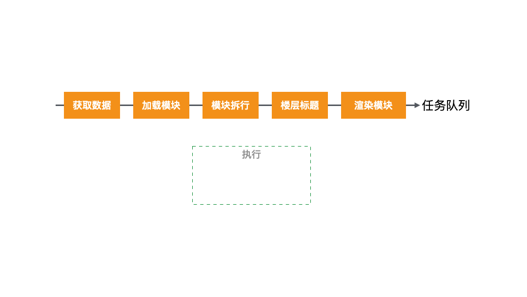 分屏渲染指的是在搭建体系中,产出的页面会先渲染首屏的模块,再渲染次屏模块。在Tubes体系中,从第一个Tube开始执行,执行到最后一个Tube则完成一次渲染(这与 Express.js 的中间件机制有点类似,一个请求进来从第一个 Middleware 开始执行,执行到最后一个Middleware结束),如下图所示: