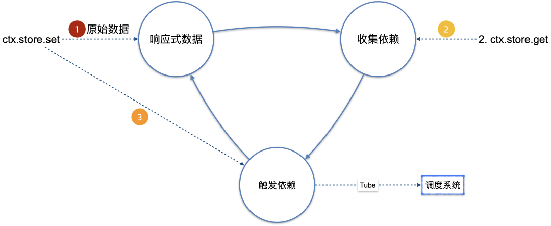 读取依赖触发依赖的时机是 “修改数据的时候” ,当监听器拦截到用户修改数据时,将对应数据的依赖找到就可以了。在 Tubes 中,依赖被找到后会发送给调度系统执行。