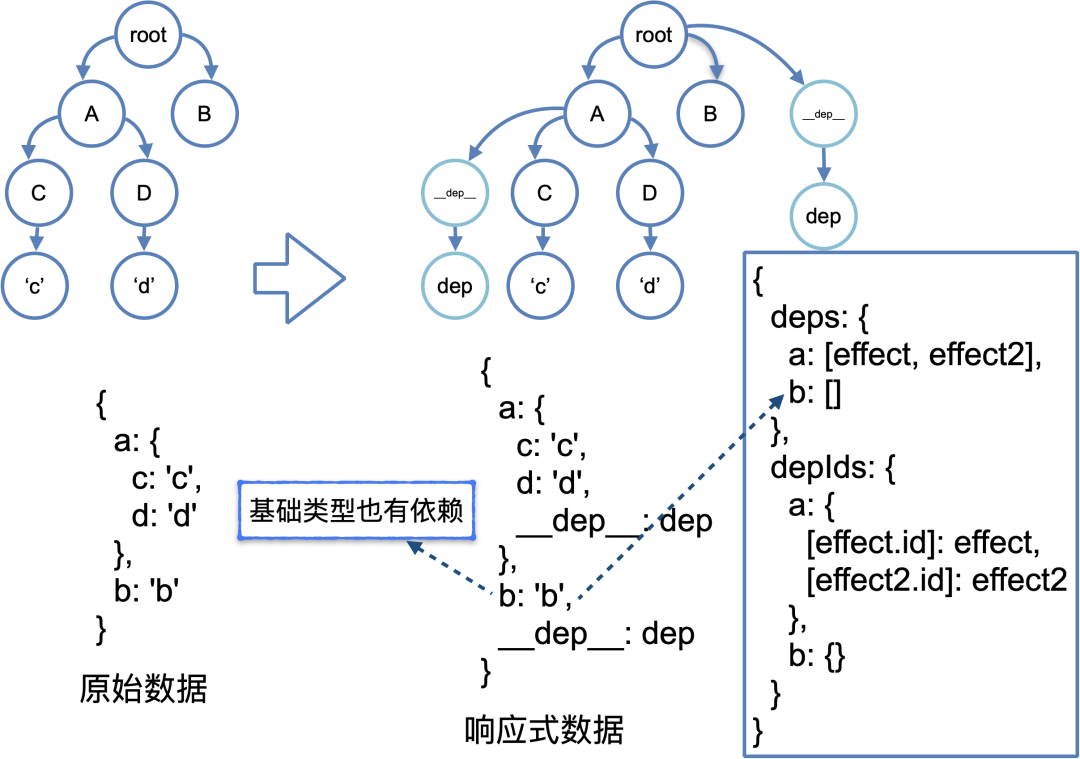 因此,我们得到一个结论:依赖不只是保存到目标数据身上,还要保存到目标数据的所有父级和所有子级中,如下图所示: