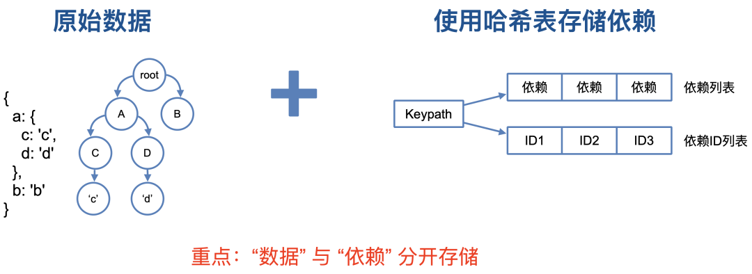 使用哈希表来存储依赖,操作依赖的速度则不受数据大小的影响,存储依赖不再需要遍历数据的每个子级,无论是保存依赖还是读取依赖都不受数据量大小的影响,可以在一瞬间完成。