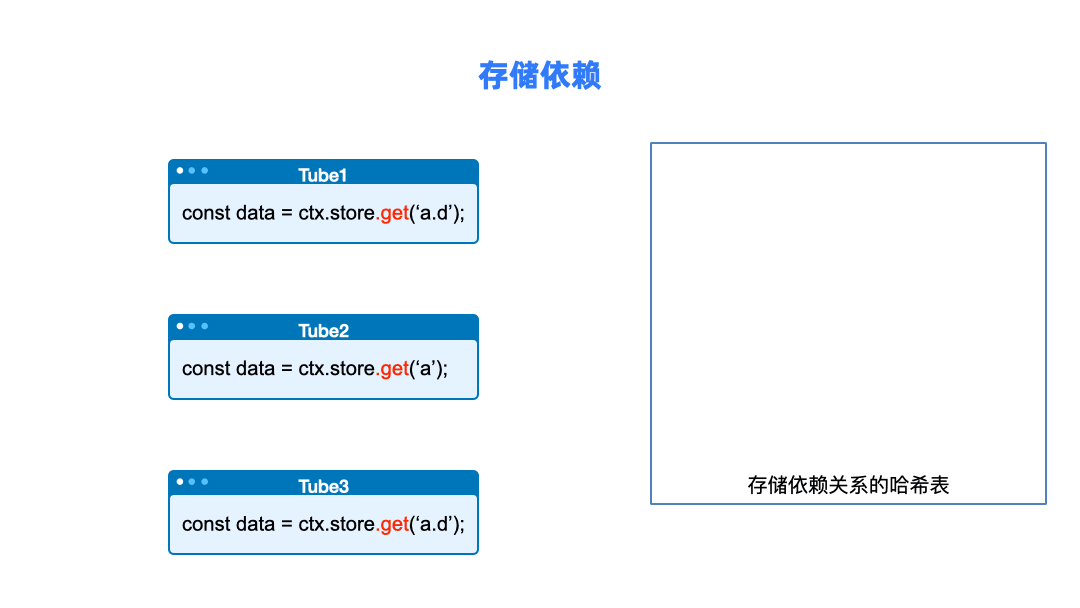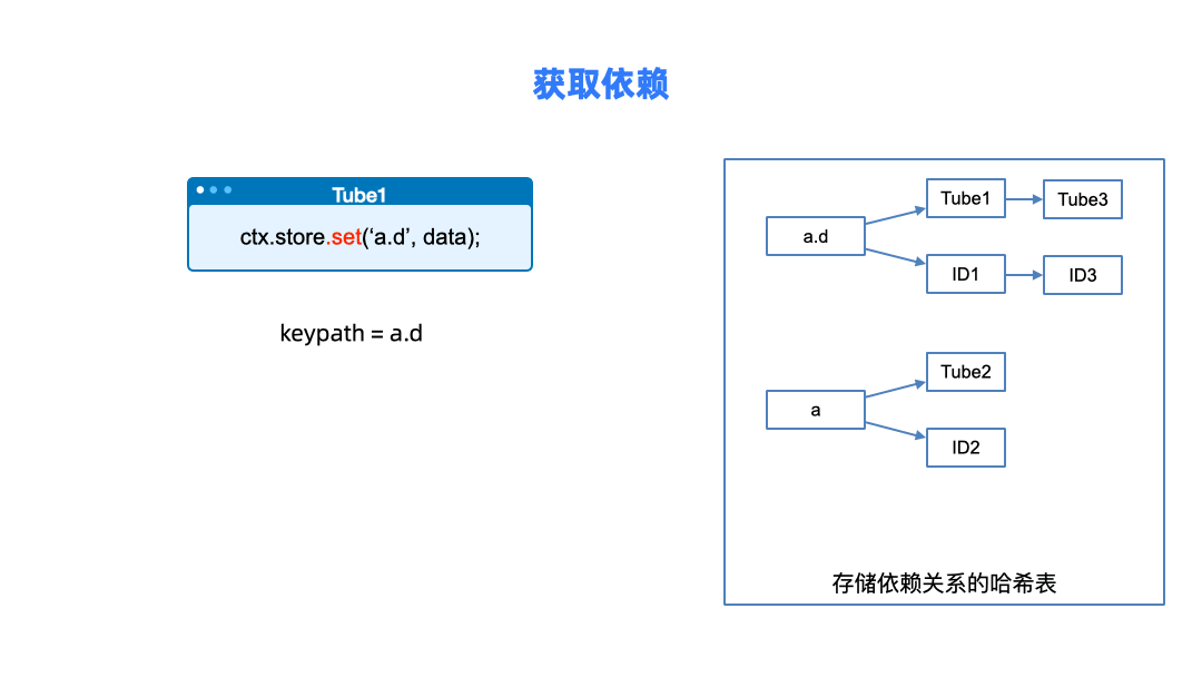 如上图所示,当用户执行 ctx.store.get(a.d) 时,直接使用 a.d 作为哈希表中的KEY将依赖追加到列表中,逻辑简单且执行效率高。