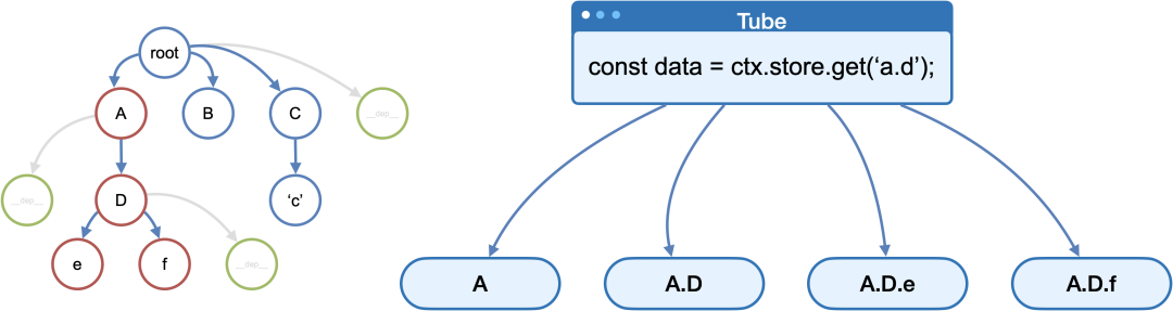 上图红色圈表示需要被订阅的数据,绿色圈表示依赖保存的位置,右侧表示当 Tube 读取 a.d 时,需要同时订阅 a、a.d、a.d.e和a.d.f。