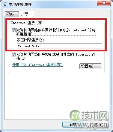 第三步、开启共享上网,打开“网络共享中心”-“更改适配器设置”【在左侧的栏里面】-找到你现在上网用的连接,右键属性,点击共享的标签,勾选第一个选项卡【如下图】,在下面的输入框点击,弹出列表,选择你的Microsoft Virtual WiFi Miniport Adapter网络连接,我这里刚刚重命名了,所以选择Virtual WiFi,确定。